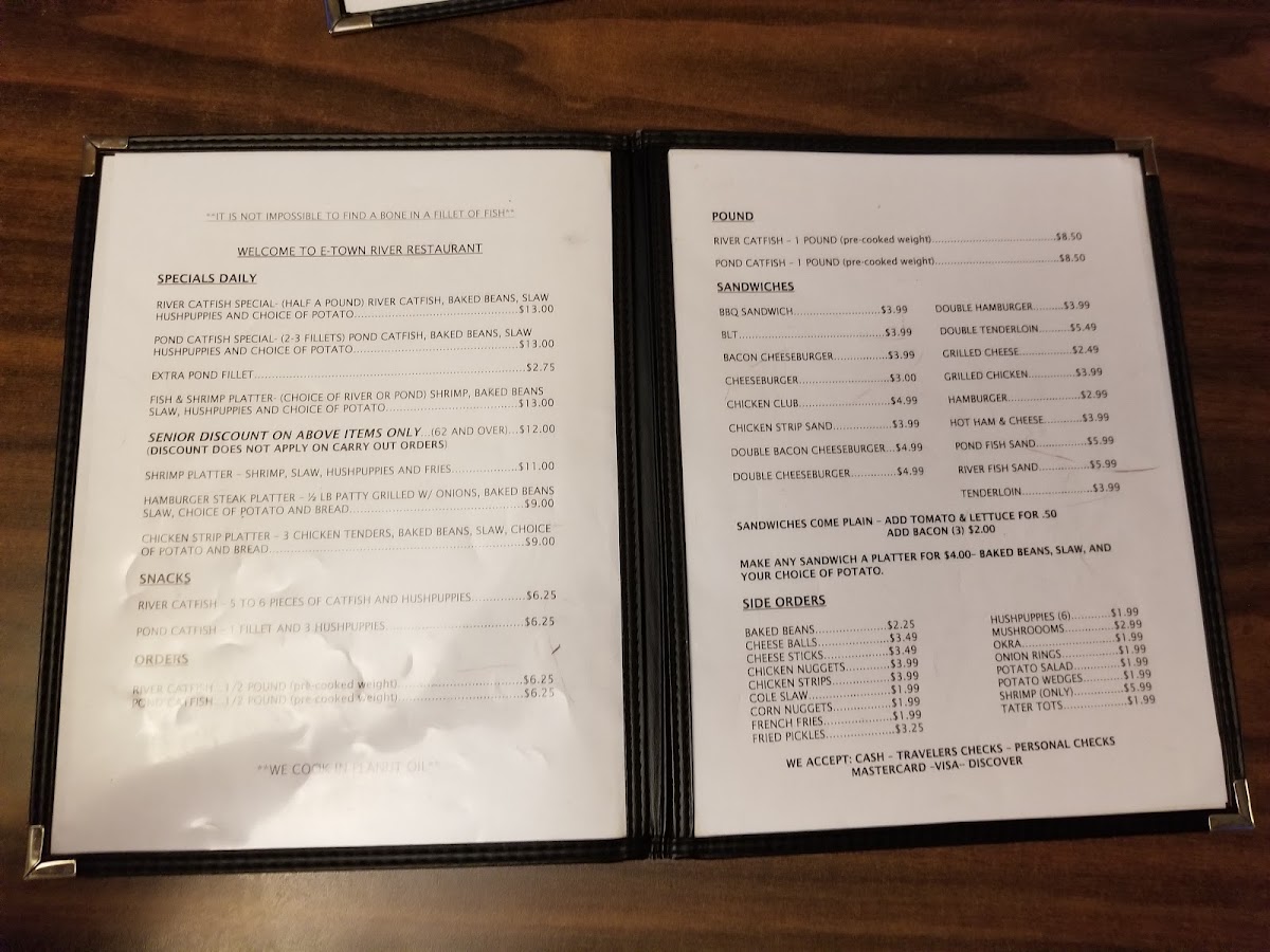 At E'town River Restaurant, the menu is a true reflection of local flavor and classic comfort. From hearty entrees to lighter options, every dish is prepared with fresh ingredients and served with a side of Southern hospitality. Whether you're craving something savory or seeking a dish with a bit of zest, the offerings cater to all tastes. From steaks and seafood to homestyle sides and house specialties, there's always something that feels just right. The E'town River Restaurant Menu is perfect for those looking to enjoy a laid-back dining experience in the heart of Elizabethtown. You’ll find everything from rich, slow-cooked meals to lighter, yet satisfying plates for a balanced dining experience. The charm of the restaurant extends to its menu, which is both inviting and diverse, offering something for everyone.